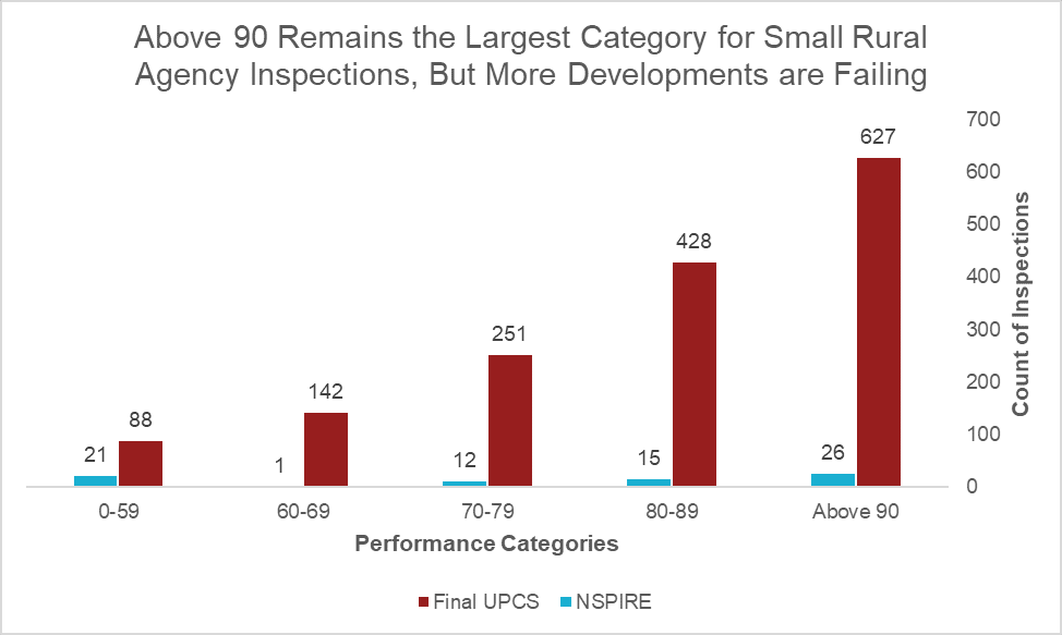 Only 75 Small Rural agency public housing developments have been inspected under NSPIRE. The average final UPCS score for Small Rural public housing developments was 85.1 and 76.5 under NSPIRE. A side-by side comparison of UPCS and NSPIRE scores is available in Figure 4. When comparing the distribution of scores by category, 90-100 is still the most common score category for small rural agencies; however, below 60 is now the second-most common whereas below 60 was the rarest under UPCS. These changes are likely due to two factors: